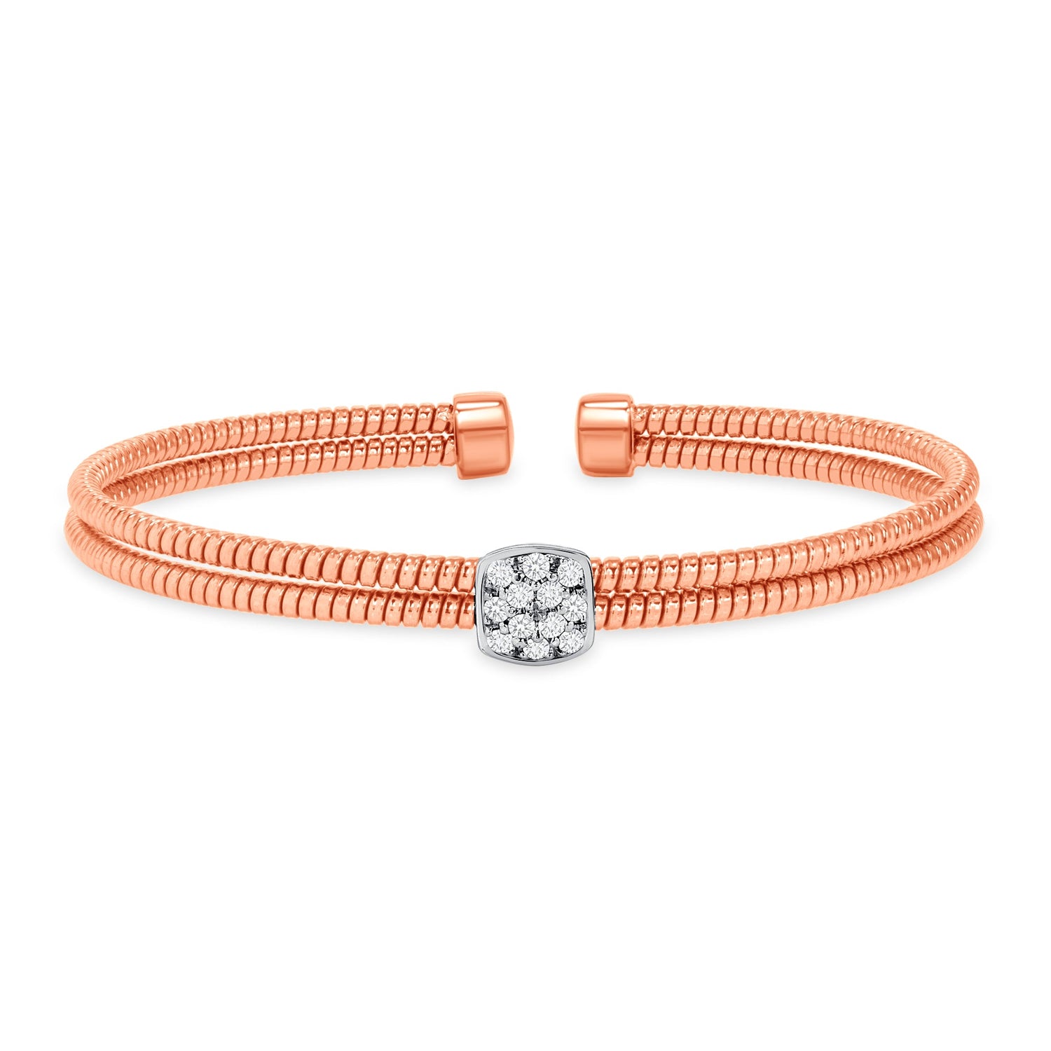Make a statement with this gorgeous two-toned bangle bracelet. Accented with 12 round diamonds, this bangle can stand alone or pair beautifully with other bracelets already in your collection.