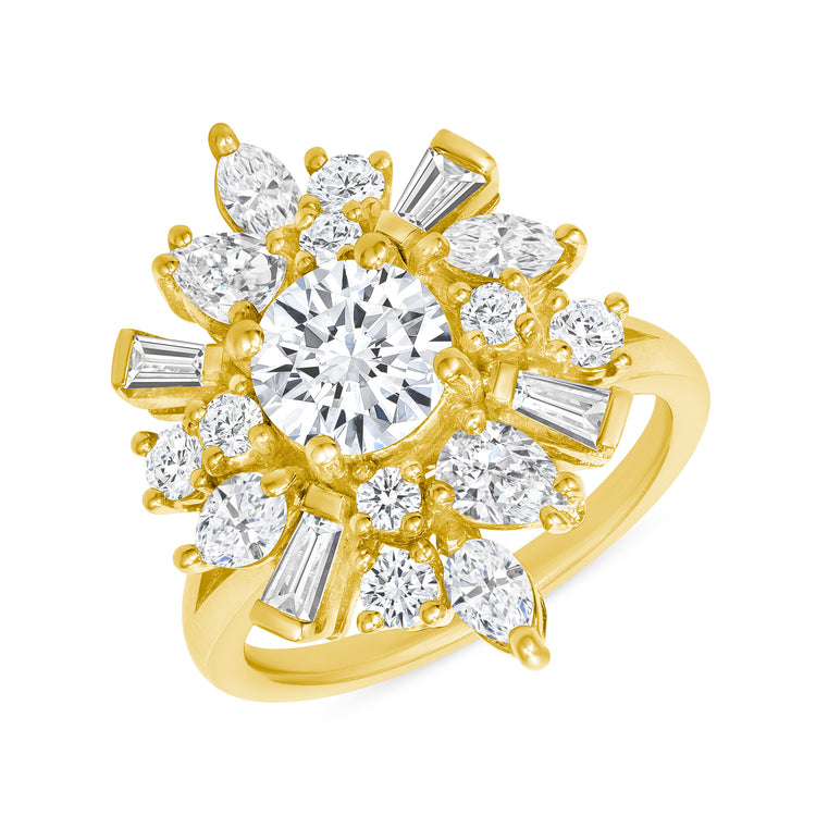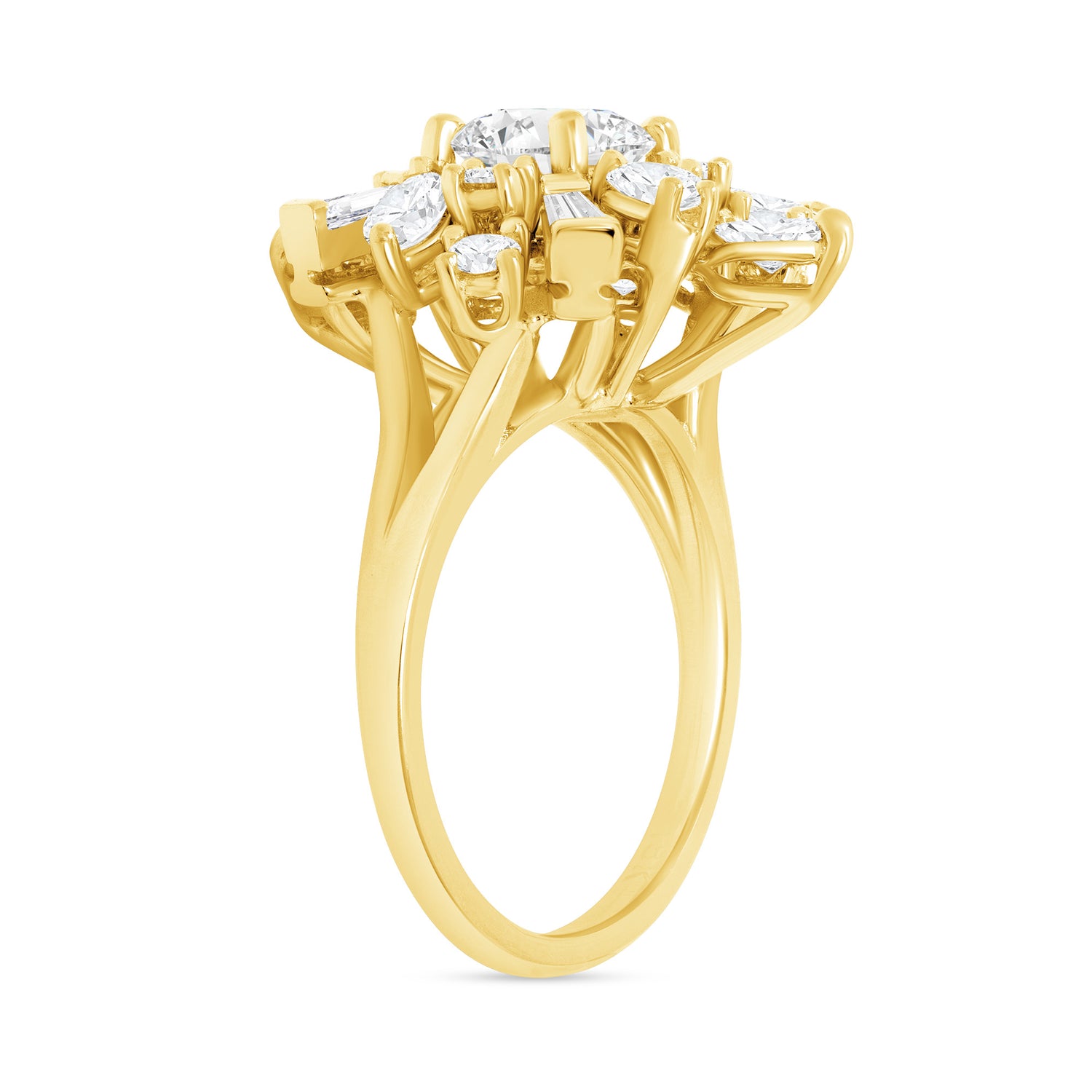 18k yellow gold ring with 18 round tapered baguettes, marquises, and pear shaped natural diamonds, 1.77 carats, and one center round natural diamond, 1.22 carats, F-SI2.