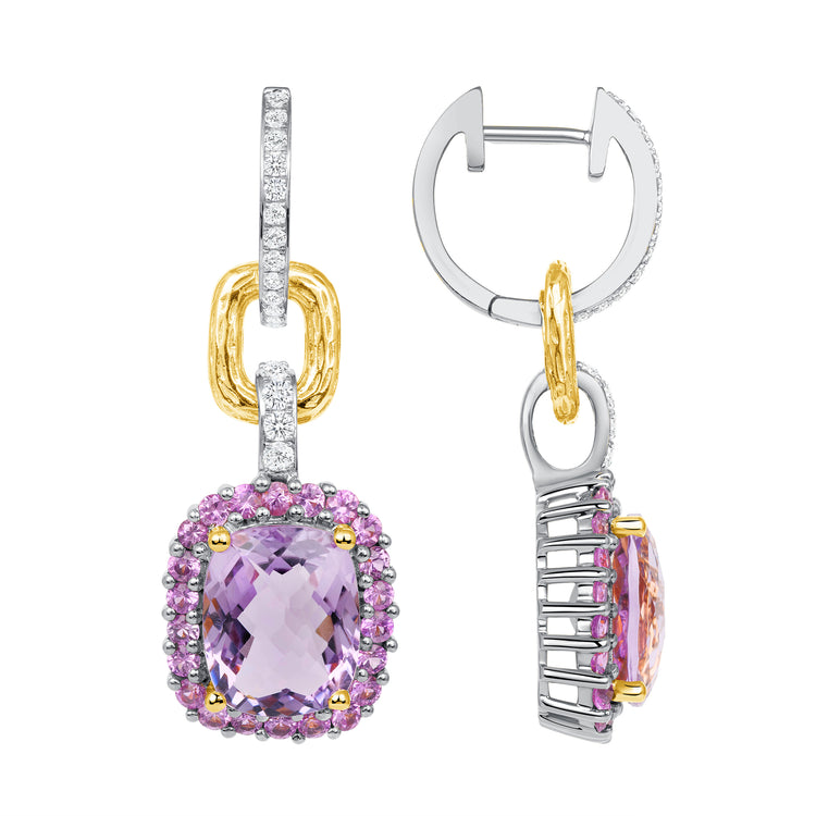 18k rose gold earrings with 36 round diamonds 0.40 ct, 42 round pink sapphires 1.21 ct, 2 cushion pink amethyst 5.38 ct