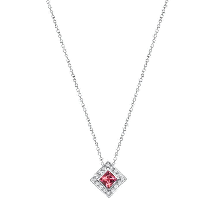 14k white gold pendant with 16 round diamonds 0.33 ct and 1 square pink tourmaline 1.05 ct