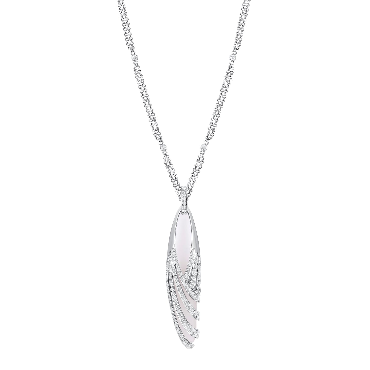 18k white gold necklace with 137 round diamonds 0.95 ct and 1 crystal 10.90 ct. 18k white gold double chain with 10 round diamonds 0.33 ct