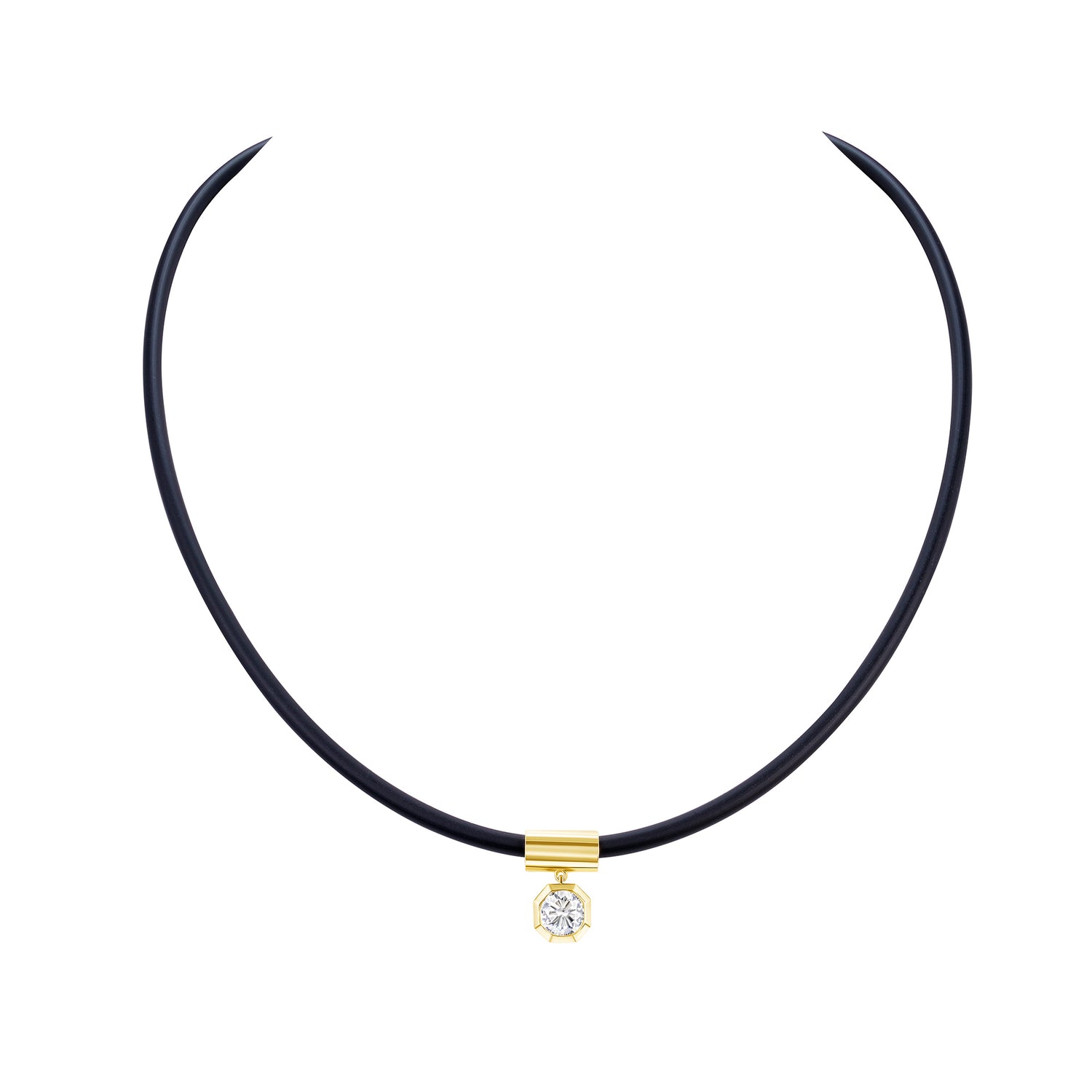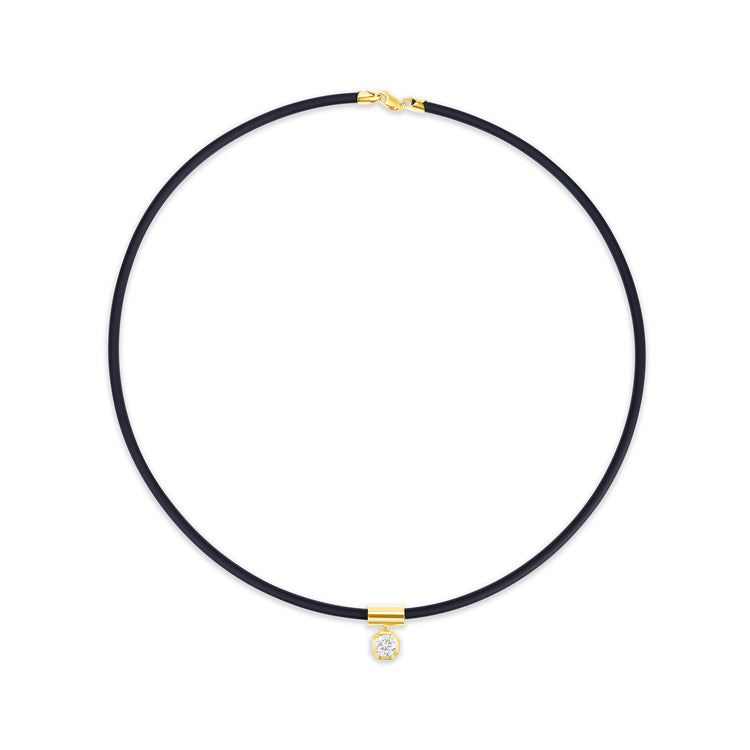 18-Inch Black Rubber Necklace featuring a 14K Yellow Gold Clasp and Pendant, set with a 0.9 Carat Round Natural Diamond of H-SI1 Clarity, EGL Certified.
